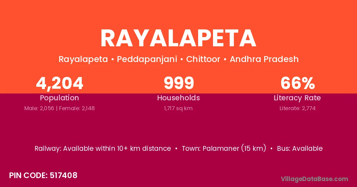 Palamaner (15 km) is the nearest town to Rayalapeta village for major economic activities and is located approximately 15 km away.