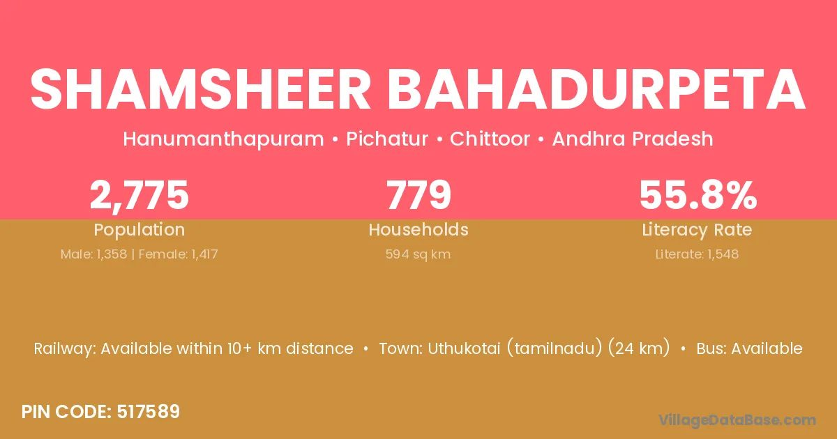 Uthukotai (tamilnadu) (24 km) is the nearest town to Shamsheer Bahadurpeta village for major economic activities and is located approximately 24 km away.