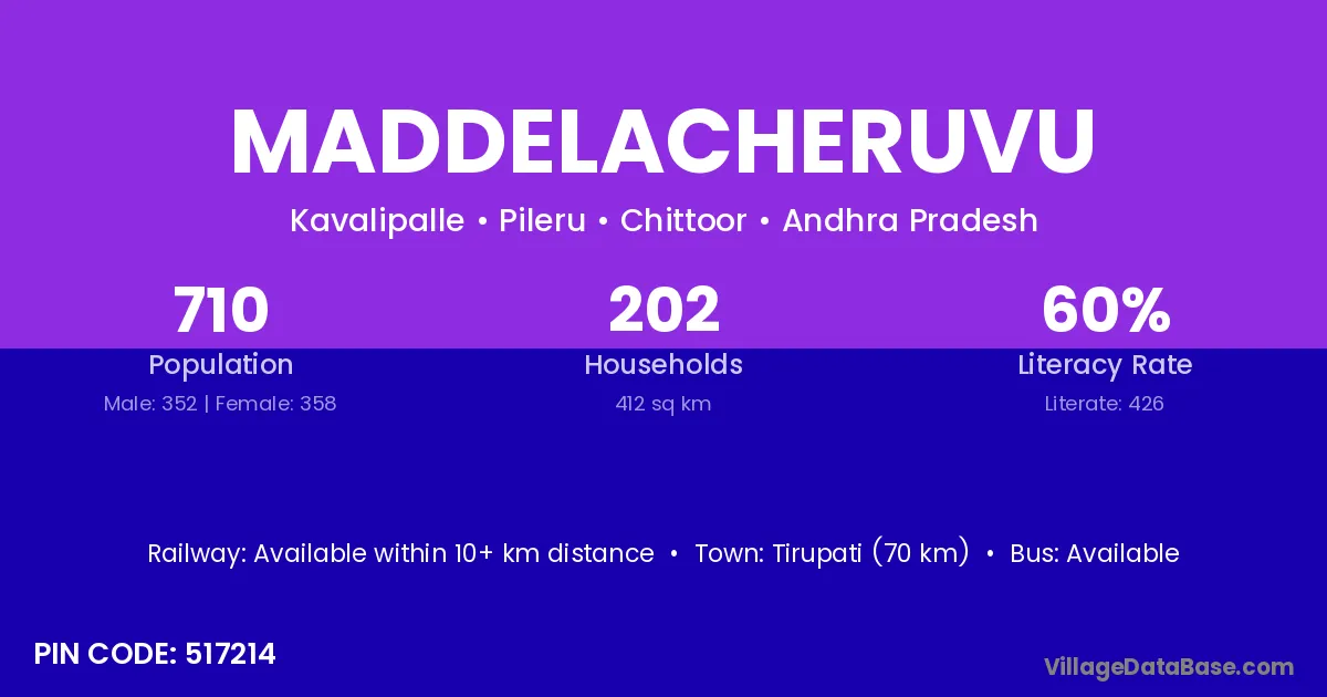 Maddelacheruvu village has a total population of 710 people, of which 352 are males and 358 are females.