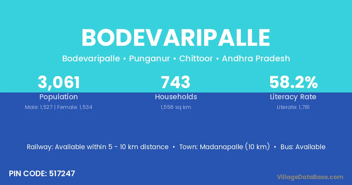 Madanapalle (10 km) is the nearest town to Bodevaripalle village for major economic activities and is located approximately 10 km away.