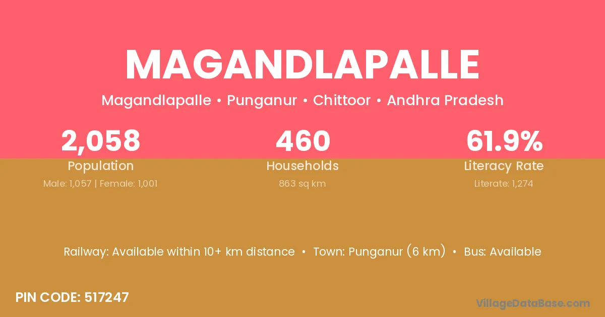 Punganur (6 km) is the nearest town to Magandlapalle village for major economic activities and is located approximately 6 km away.