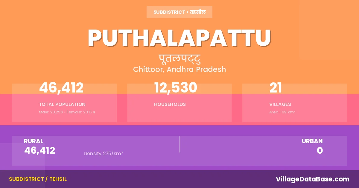 According to the 2011 census The total area of Puthalapattu Mandal is 169 km², with a population of 46412 people. The population density is 275 inhabitants per square kilometre, and there are approximately 12530 houses in the sub district.