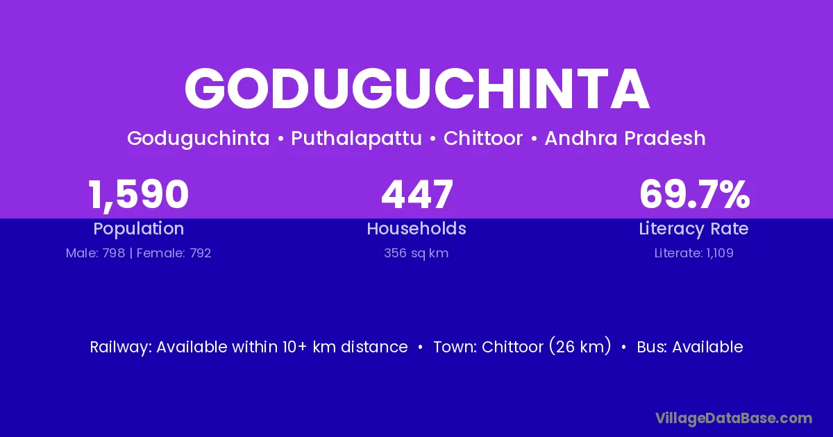 Chittoor (26 km) is the nearest town to Goduguchinta village for major economic activities and is located approximately 26 km away.