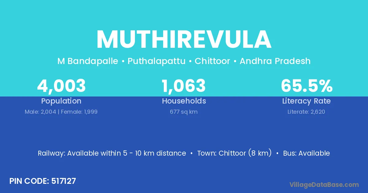 Chittoor (8 km) is the nearest town to Muthirevula village for major economic activities and is located approximately 8 km away.