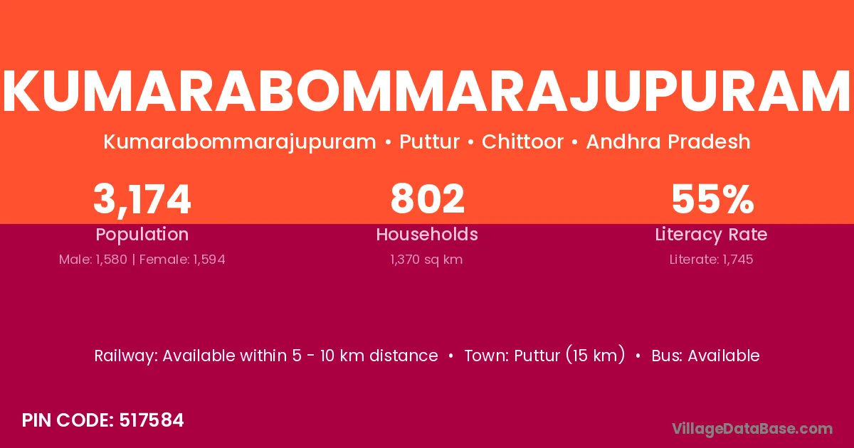 Puttur (15 km) is the nearest town to Kumarabommarajupuram village for major economic activities and is located approximately 15 km away.