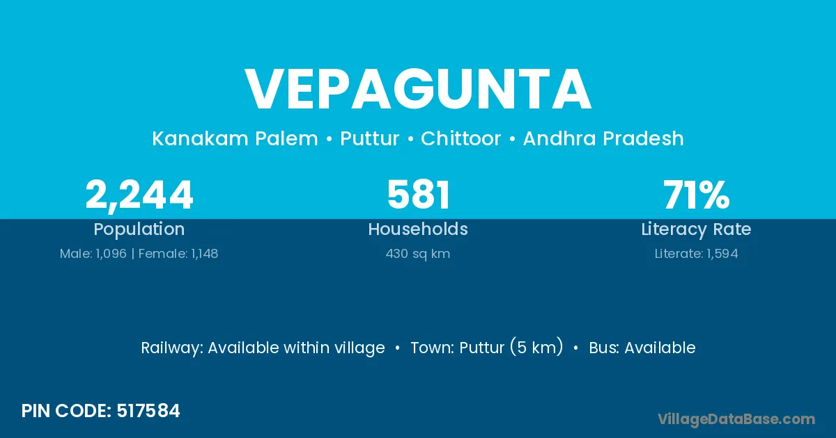 Puttur (5 km) is the nearest town to Vepagunta village for major economic activities and is located approximately 5 km away.