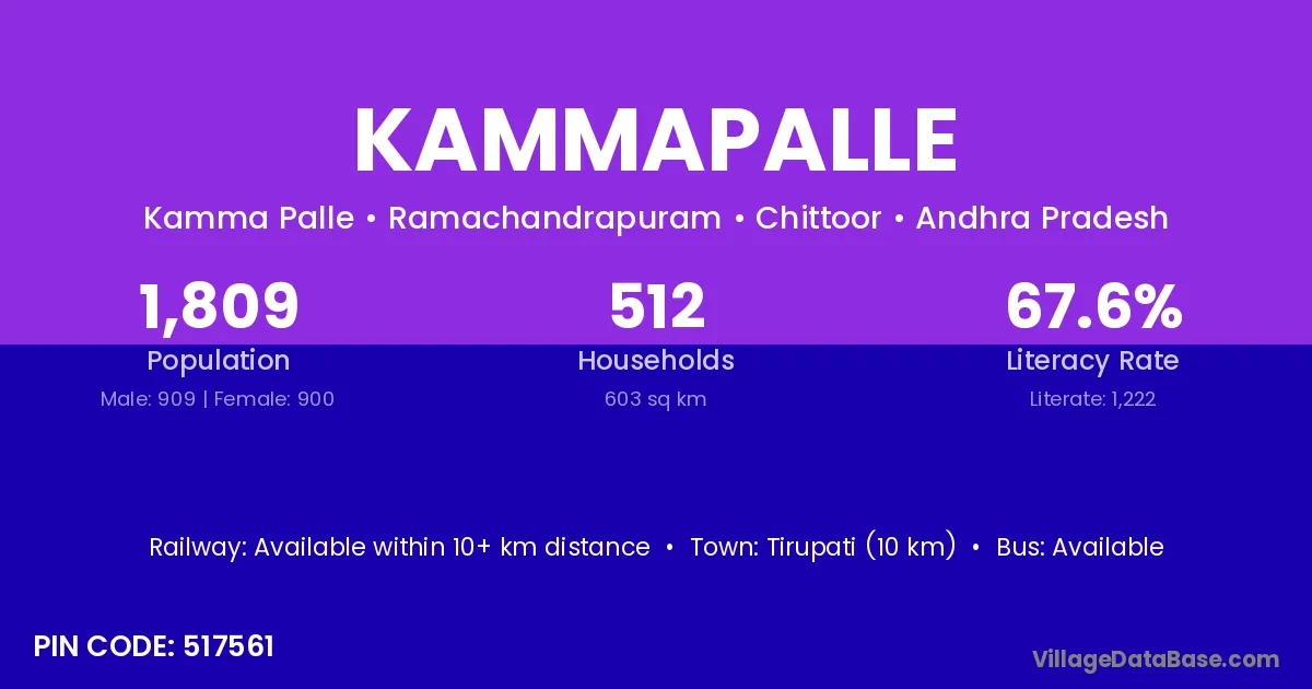 Tirupati (10 km) is the nearest town to Kammapalle village for major economic activities and is located approximately 10 km away.