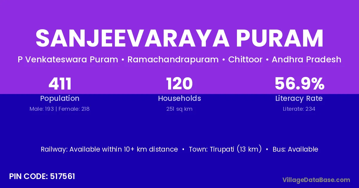 Tirupati (13 km) is the nearest town to Sanjeevaraya Puram village for major economic activities and is located approximately 13 km away.
