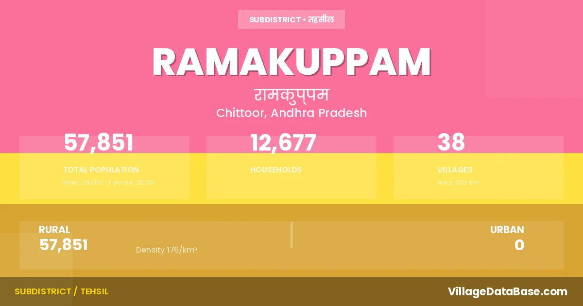 According to the 2011 census The total area of Ramakuppam Mandal is 329 km², with a population of 57851 people. The population density is 176 inhabitants per square kilometre, and there are approximately 12677 houses in the sub district.