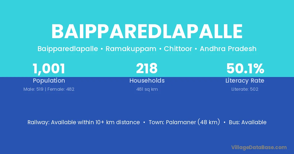 Baipparedlapalle village has a total population of 1,001 people, of which 519 are males and 482 are females.