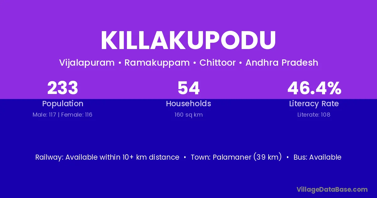 Killakupodu village has a total population of 233 people, of which 117 are males and 116 are females.