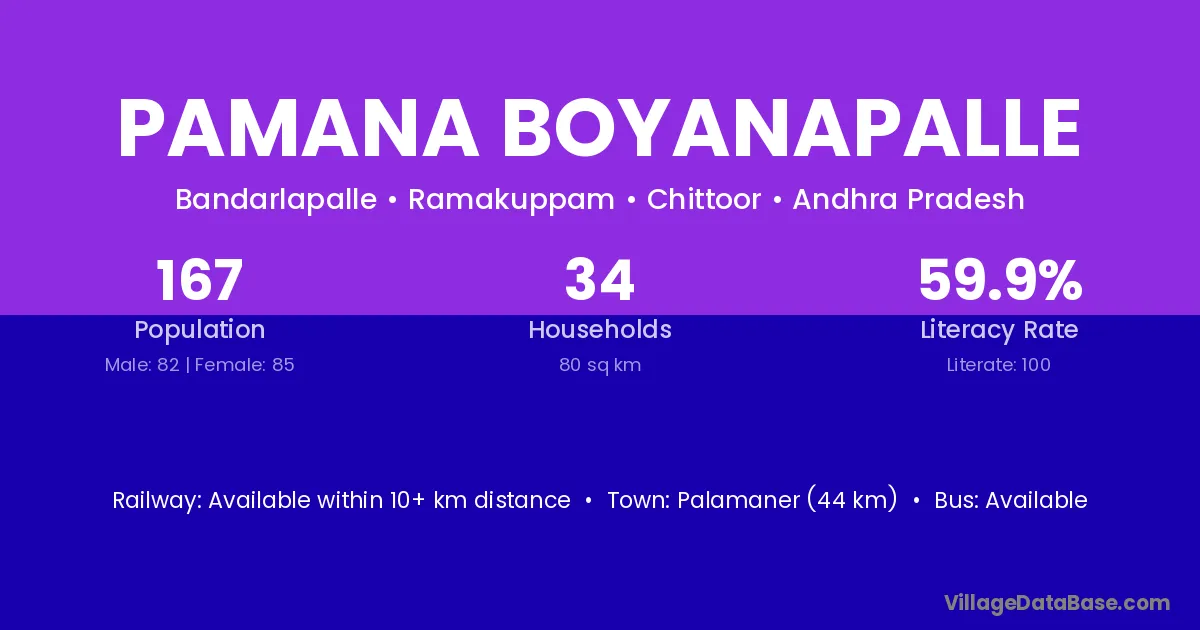 Palamaner (44 km) is the nearest town to Pamana Boyanapalle village for major economic activities and is located approximately 44 km away.