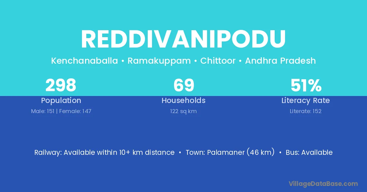 Palamaner (46 km) is the nearest town to Reddivanipodu village for major economic activities and is located approximately 46 km away.