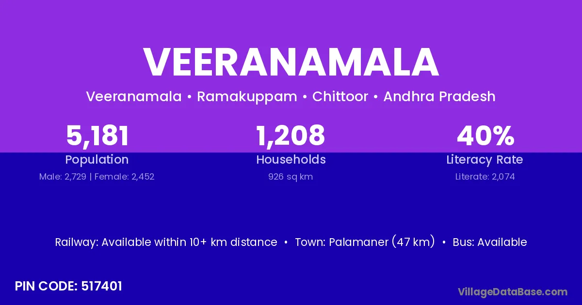 Palamaner (47 km) is the nearest town to Veeranamala village for major economic activities and is located approximately 47 km away.