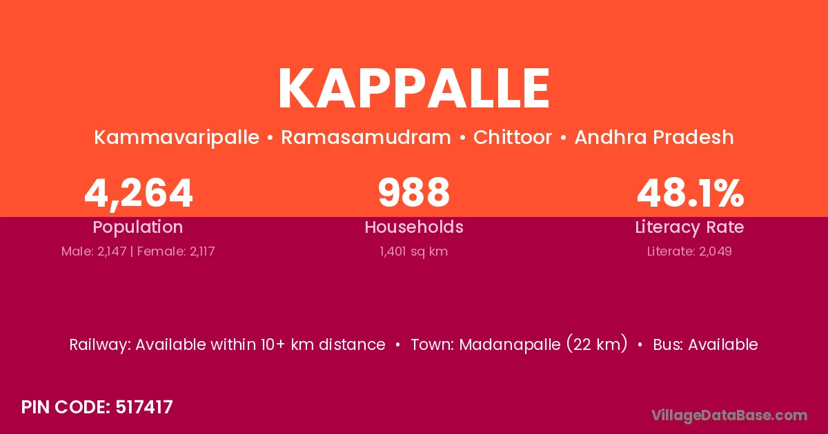 Madanapalle (22 km) is the nearest town to Kappalle village for major economic activities and is located approximately 22 km away.