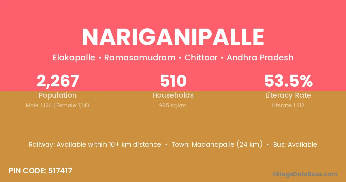 Nariganipalle village has a total population of 2,267 people, of which 1,124 are males and 1,143 are females.