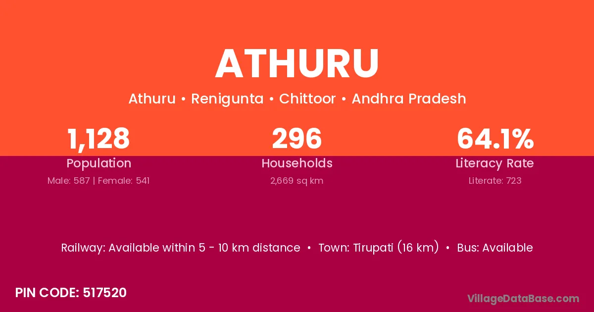 Tirupati (16 km) is the nearest town to Athuru village for major economic activities and is located approximately 16 km away.