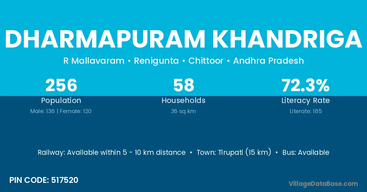 Tirupati (15 km) is the nearest town to Dharmapuram Khandriga village for major economic activities and is located approximately 15 km away.