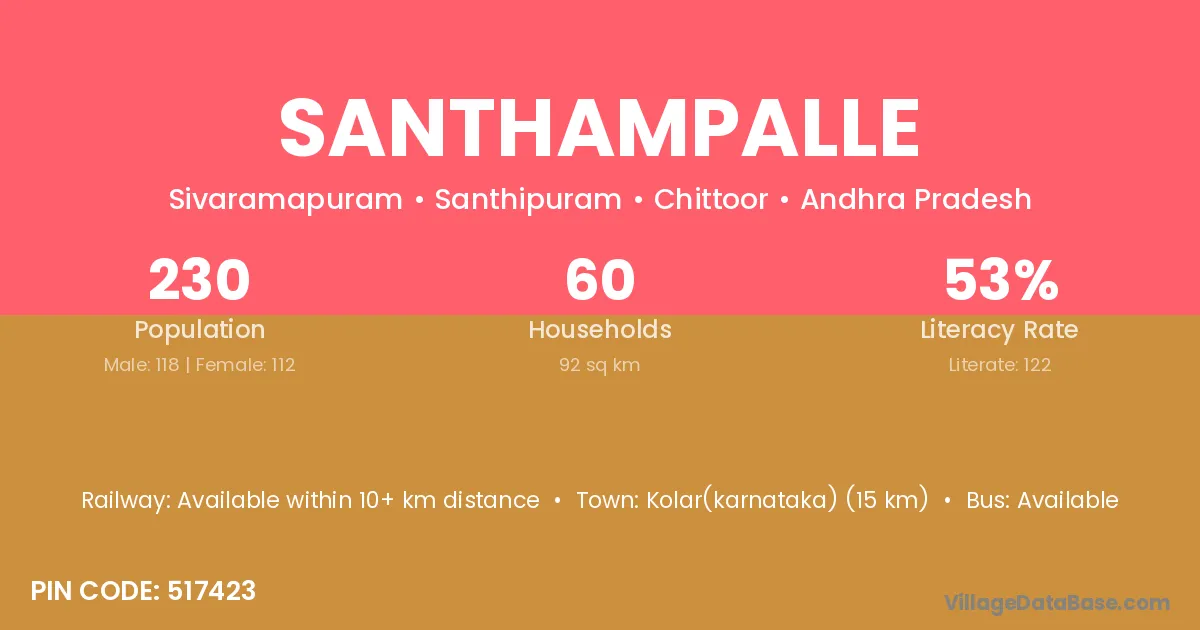 Santhampalle village has a total population of 230 people, of which 118 are males and 112 are females.
