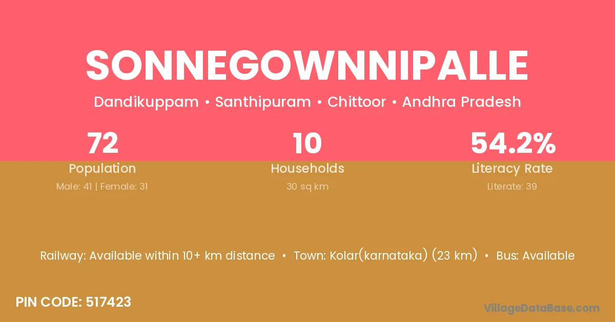Kolar(karnataka) (23 km) is the nearest town to Sonnegownnipalle village for major economic activities and is located approximately 23 km away.