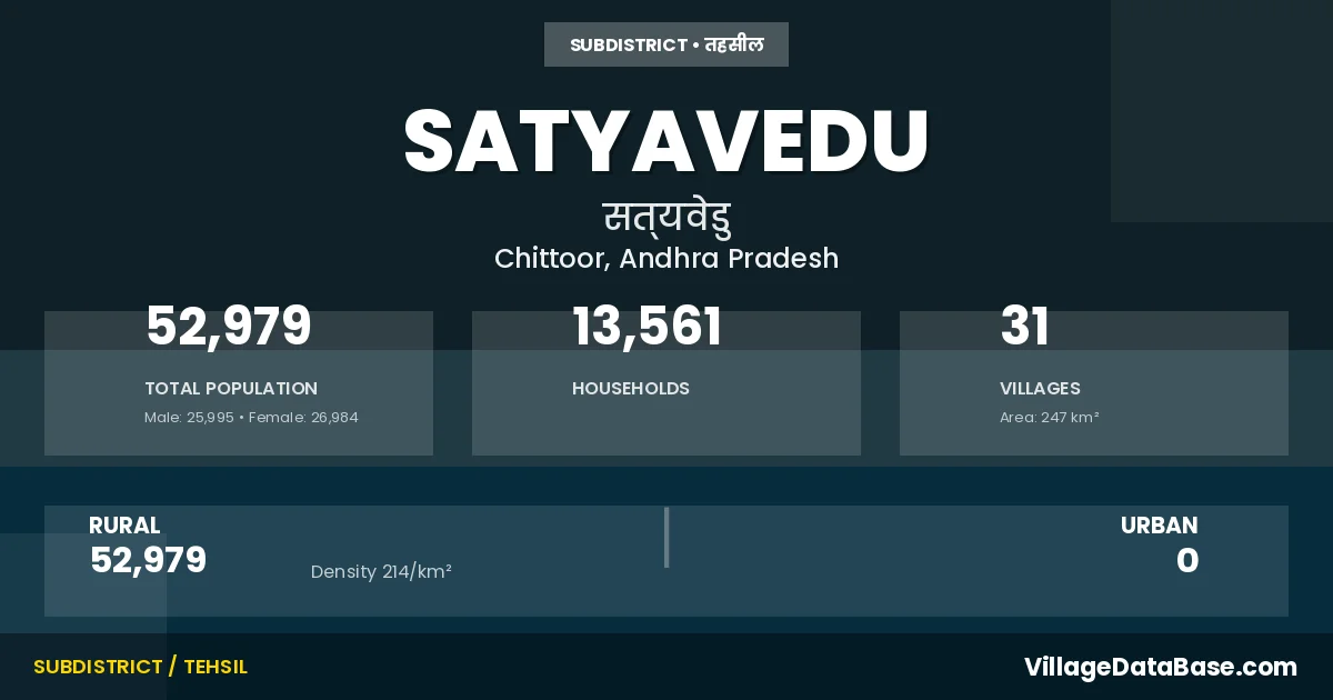 According to the 2011 census The total area of Satyavedu Mandal is 247 km², with a population of 52979 people. The population density is 214 inhabitants per square kilometre, and there are approximately 13561 houses in the sub district.