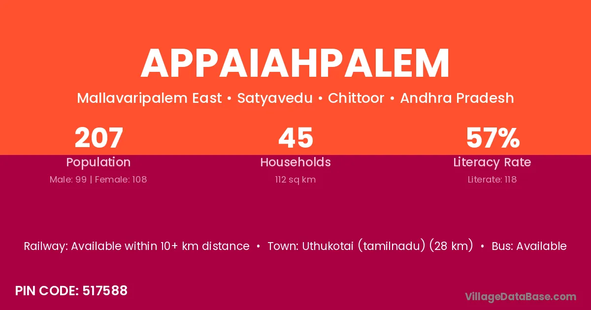 Uthukotai (tamilnadu) (28 km) is the nearest town to Appaiahpalem village for major economic activities and is located approximately 28 km away.