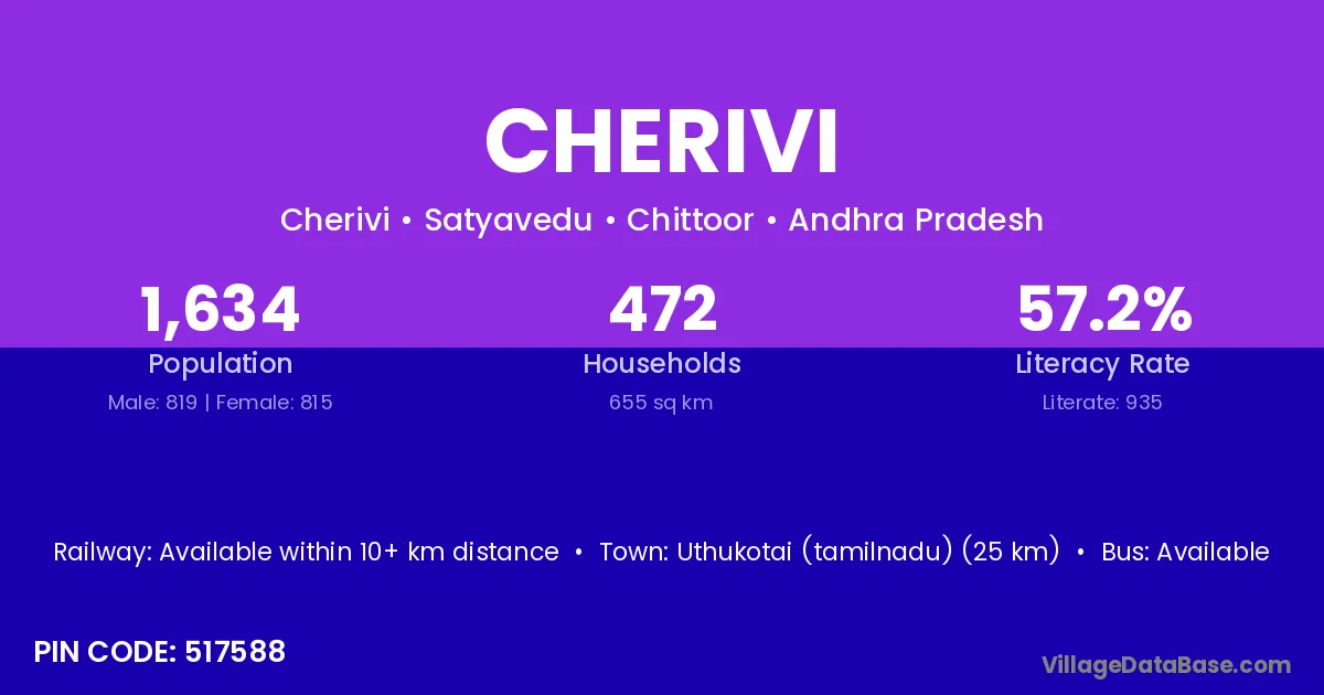 Uthukotai (tamilnadu) (25 km) is the nearest town to Cherivi village for major economic activities and is located approximately 25 km away.