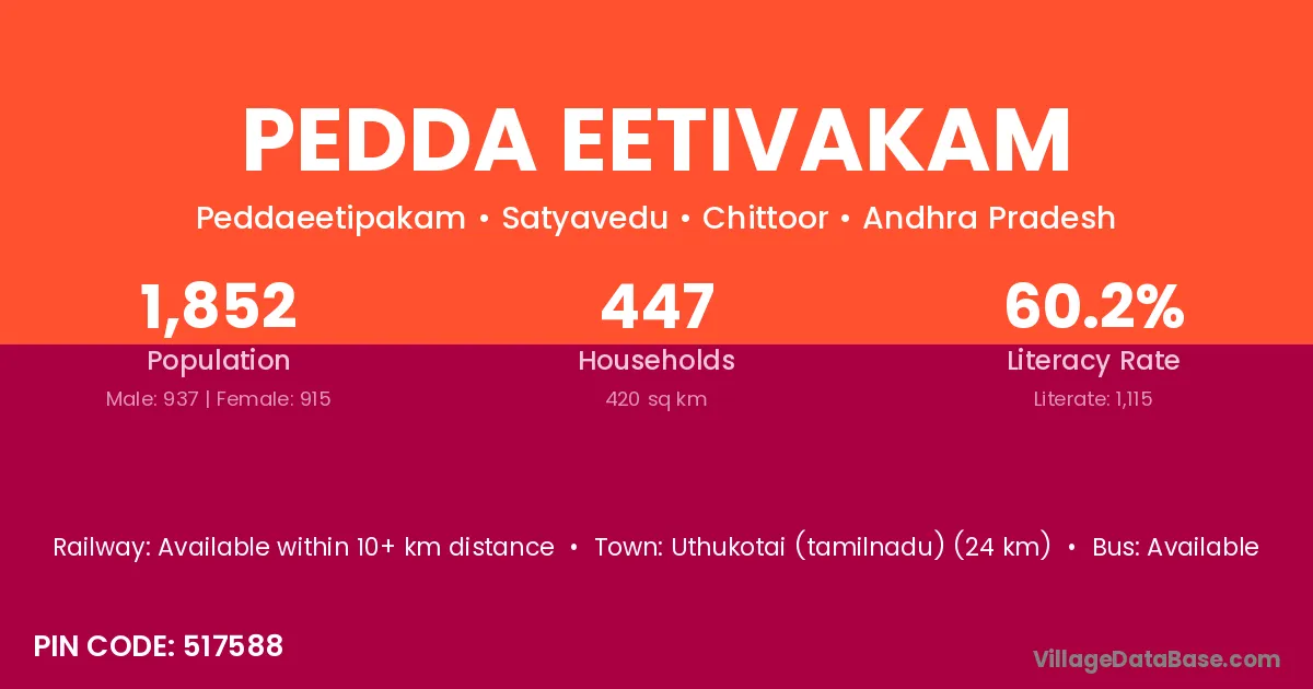 Uthukotai (tamilnadu) (24 km) is the nearest town to Pedda Eetivakam village for major economic activities and is located approximately 24 km away.
