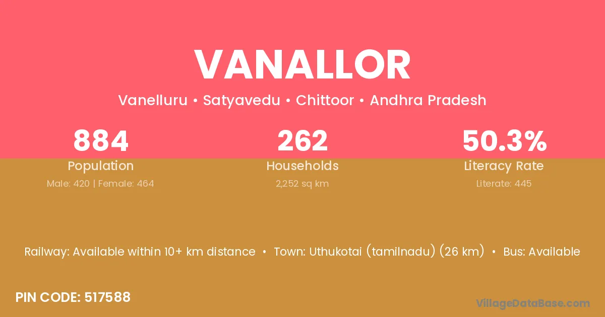 Uthukotai (tamilnadu) (26 km) is the nearest town to Vanallor village for major economic activities and is located approximately 26 km away.