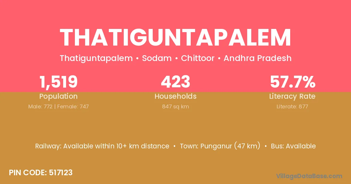 Thatiguntapalem village has a total population of 1,519 people, of which 772 are males and 747 are females.