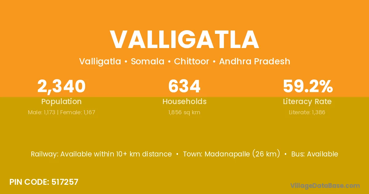 Madanapalle (26 km) is the nearest town to Valligatla village for major economic activities and is located approximately 26 km away.