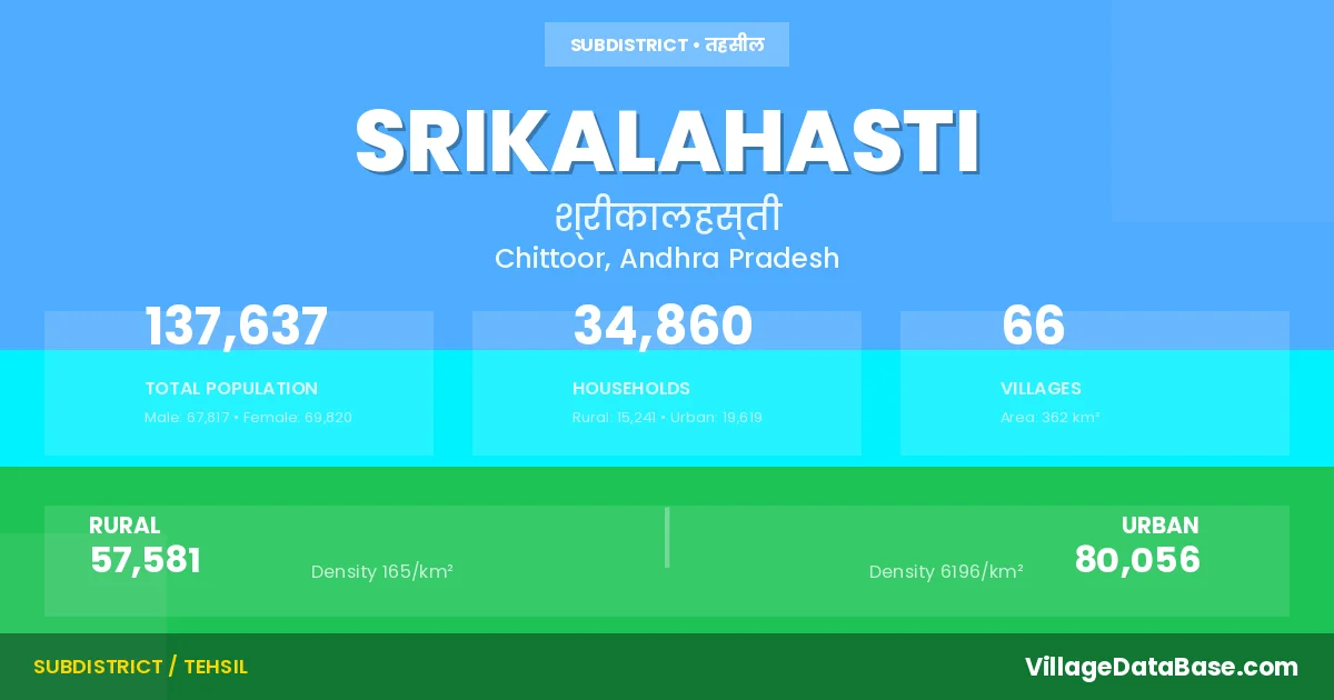 According to the 2011 census The total area of Srikalahasti Mandal is 362 km², with a population of 137637 people. The population density is 381 inhabitants per square kilometre, and there are approximately 34860 houses in the sub district.