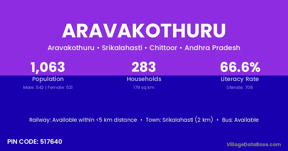 Srikalahasti (2 km) is the nearest town to Aravakothuru village for major economic activities and is located approximately 2 km away.