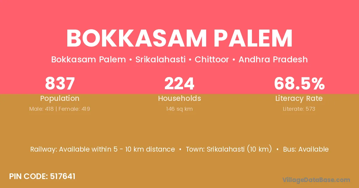 Bokkasam Palem village has a total population of 837 people, of which 418 are males and 419 are females.