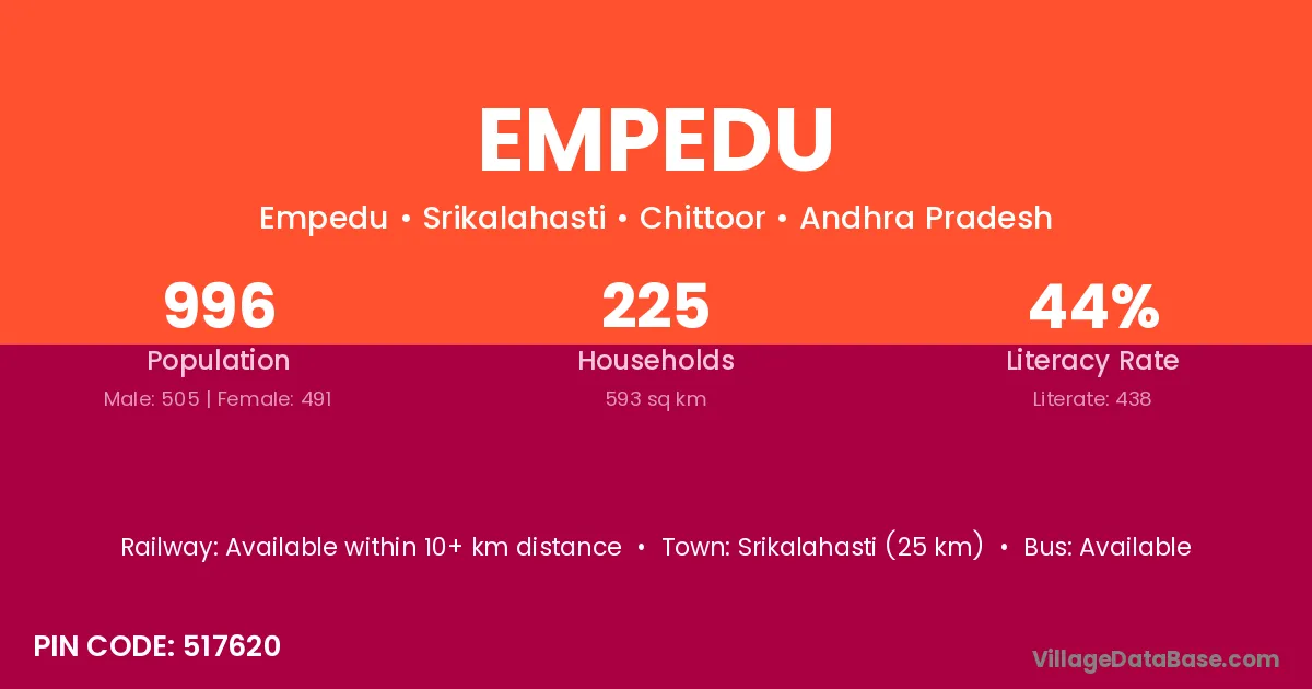 The literacy rate of Empedu village is 43.98%. Male literacy stands at 49.11% and female literacy at 38.70%.