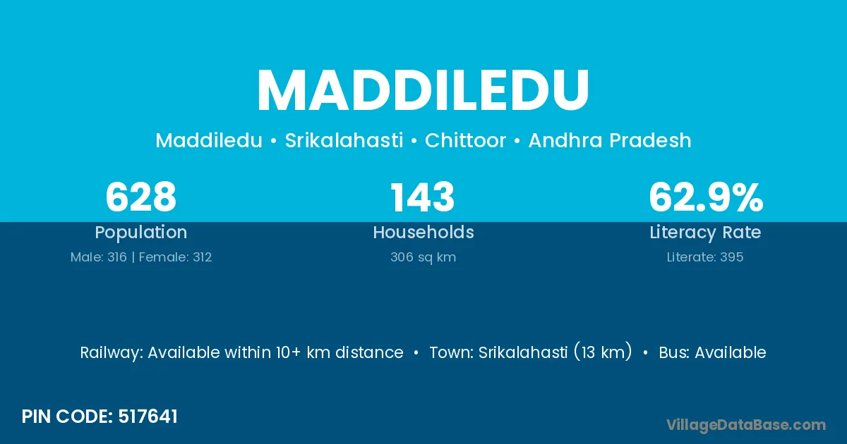 Srikalahasti (13 km) is the nearest town to Maddiledu village for major economic activities and is located approximately 13 km away.