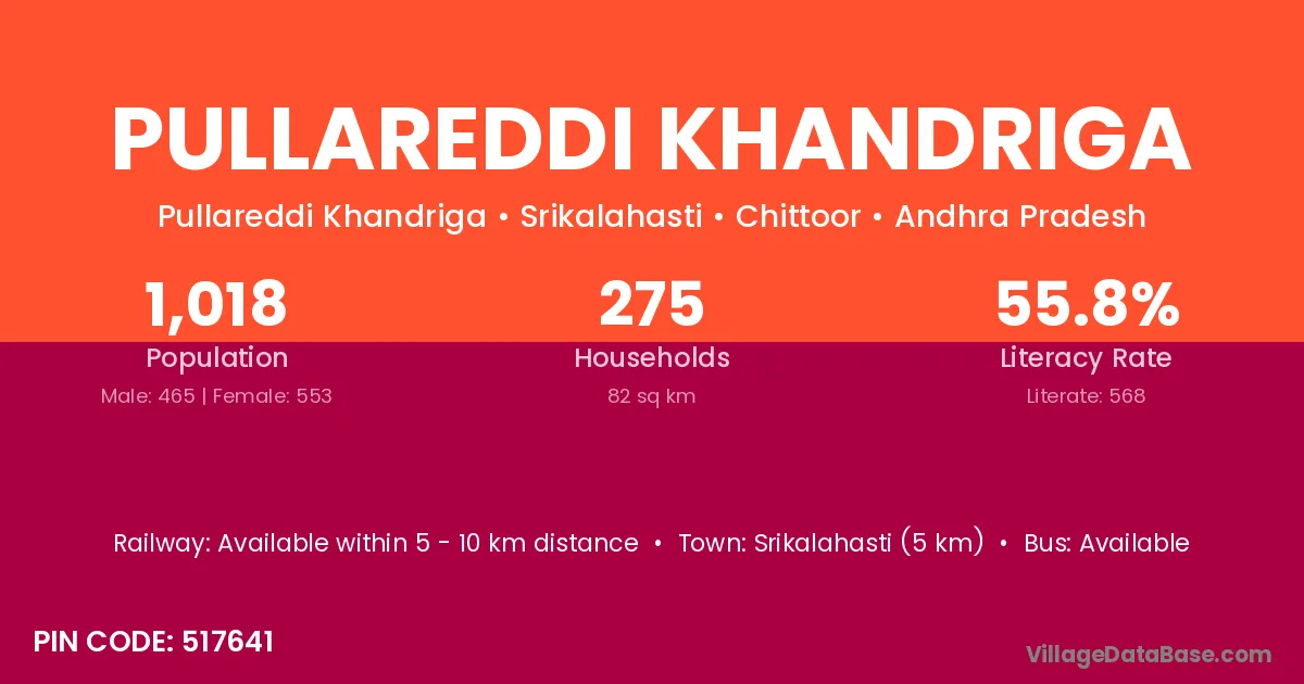 Srikalahasti (5 km) is the nearest town to Pullareddi Khandriga village for major economic activities and is located approximately 5 km away.