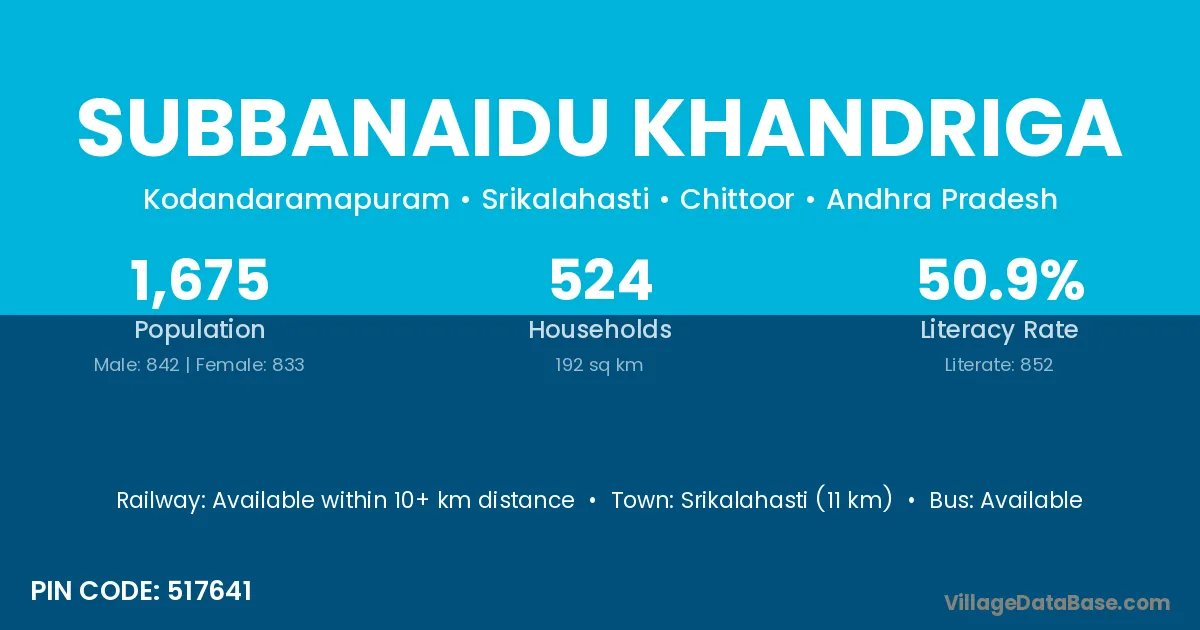 Srikalahasti (11 km) is the nearest town to Subbanaidu Khandriga village for major economic activities and is located approximately 11 km away.