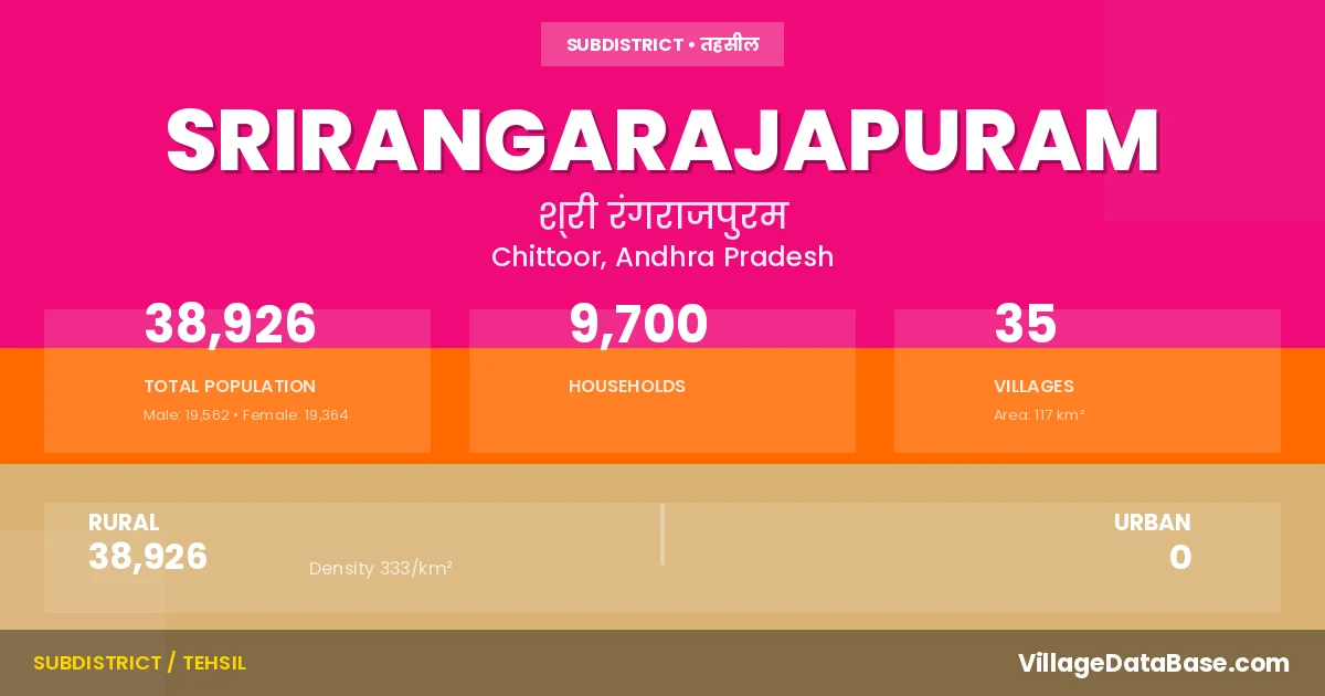 According to the 2011 census The total area of Srirangarajapuram Mandal is 117 km², with a population of 38926 people. The population density is 333 inhabitants per square kilometre, and there are approximately 9700 houses in the sub district.