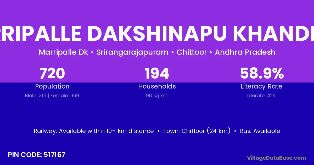 Chittoor (24 km) is the nearest town to Marripalle Dakshinapu Khandriga village for major economic activities and is located approximately 24 km away.