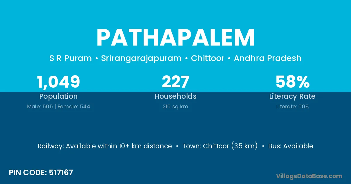 Chittoor (35 km) is the nearest town to Pathapalem village for major economic activities and is located approximately 35 km away.