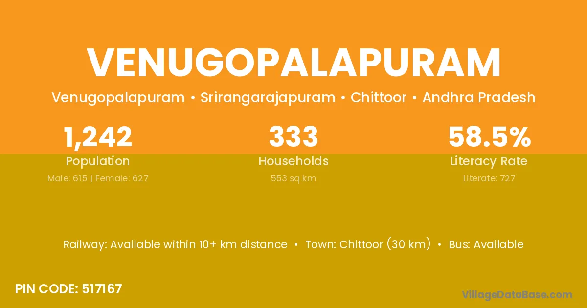 Chittoor (30 km) is the nearest town to Venugopalapuram village for major economic activities and is located approximately 30 km away.