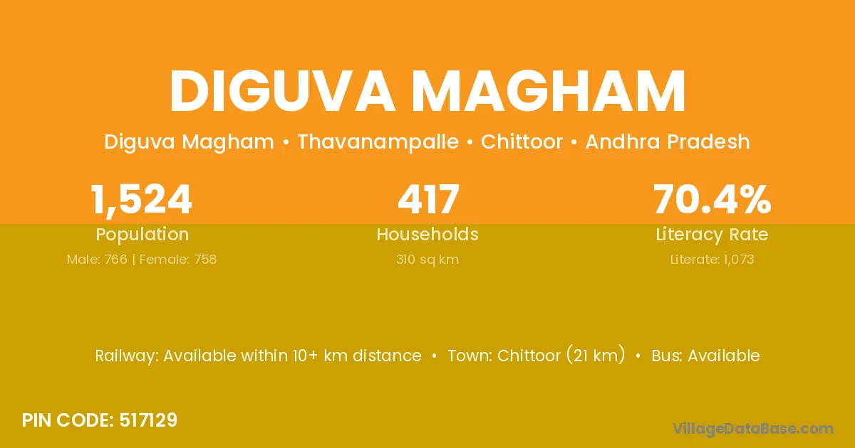 Chittoor (21 km) is the nearest town to Diguva Magham village for major economic activities and is located approximately 21 km away.