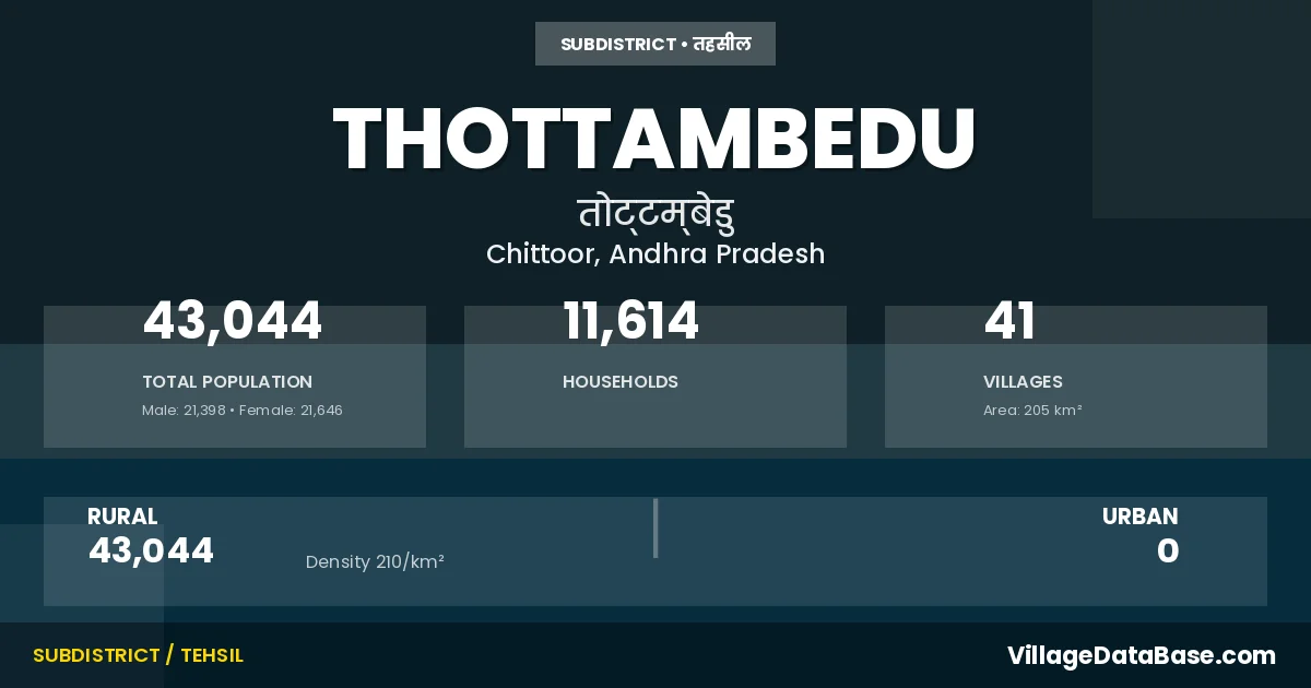 According to the 2011 census The total area of Thottambedu Mandal is 205 km², with a population of 43044 people. The population density is 210 inhabitants per square kilometre, and there are approximately 11614 houses in the sub district.