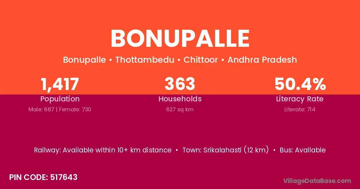Srikalahasti (12 km) is the nearest town to Bonupalle village for major economic activities and is located approximately 12 km away.