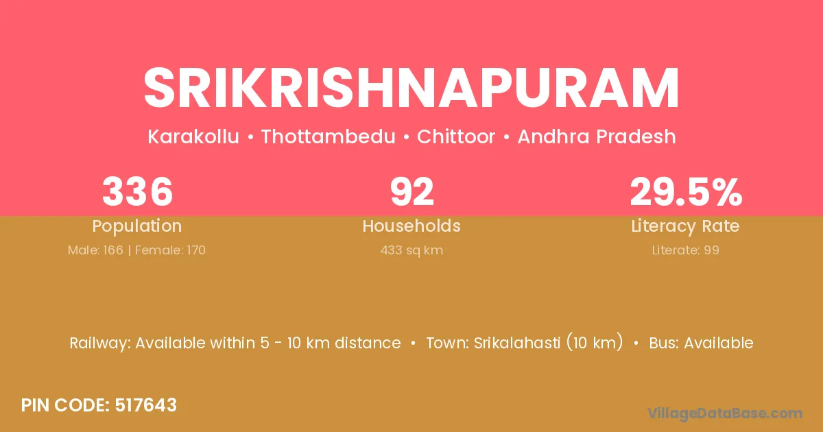 Srikrishnapuram village has a total population of 336 people, of which 166 are males and 170 are females.