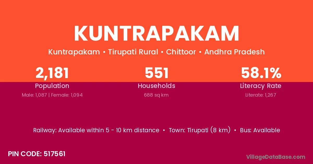 Tirupati (8 km) is the nearest town to Kuntrapakam village for major economic activities and is located approximately 8 km away.