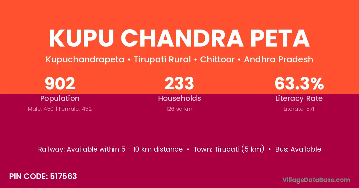 Kupu Chandra Peta village has a total population of 902 people, of which 450 are males and 452 are females.