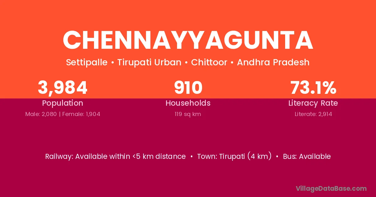 Chennayyagunta village has a total population of 3,984 people, of which 2,080 are males and 1,904 are females.