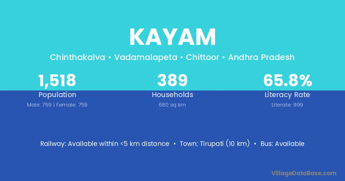 Tirupati (10 km) is the nearest town to Kayam village for major economic activities and is located approximately 10 km away.